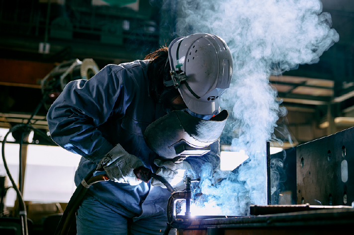 鉄やステンレスなどの金属を切断・曲げ加工・溶接といった技術・技能を駆使して、立体的な製品をつくる職種です。主にクレーンや圧力タンクなどの製作を行っています。